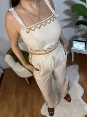Ayarlanabilir askılı pamuk keten crop ve pantalon. Yan nakış detaylı. Sırt ve bel kısmı lastiklidir.