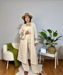 Ayarlanabilir askılı pamuk keten crop ve pantalon. Yan nakış detaylı. Sırt ve bel kısmı lastiklidir.